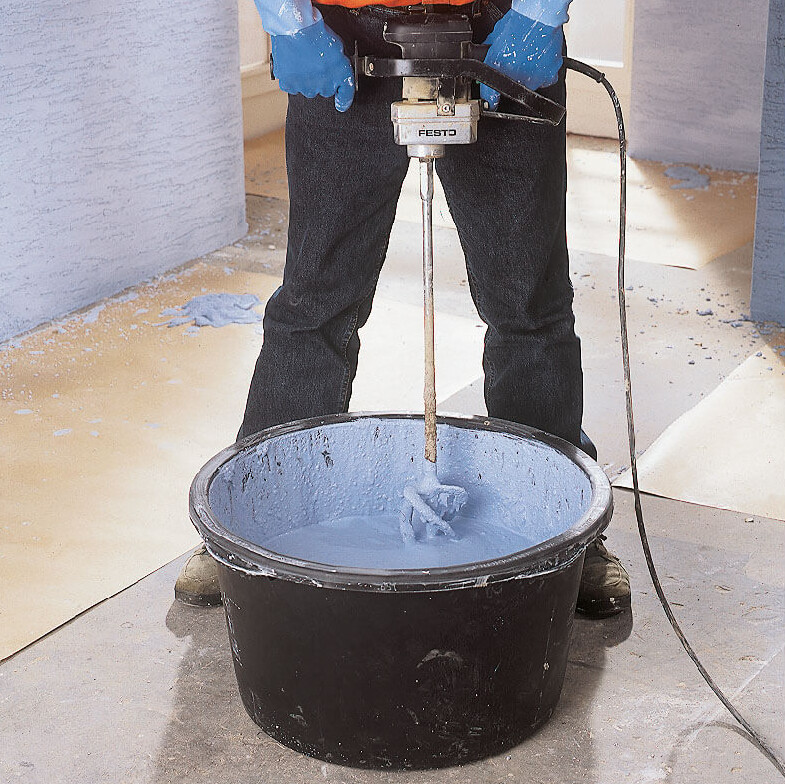 Malerrolle, Bohrmaschine, Rührquirl, Mörtelkübel, Glättkelle, Maurerkelle, Kunststoffreibebrett, Folie und Klebeband