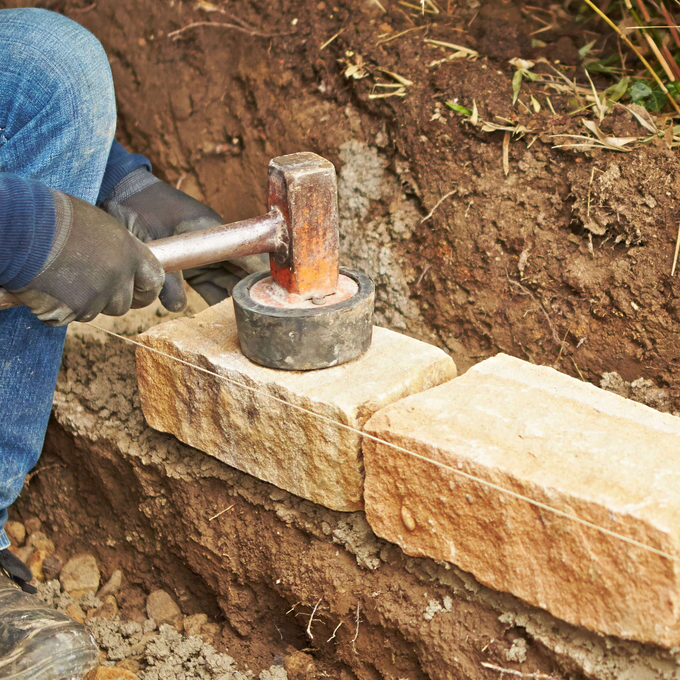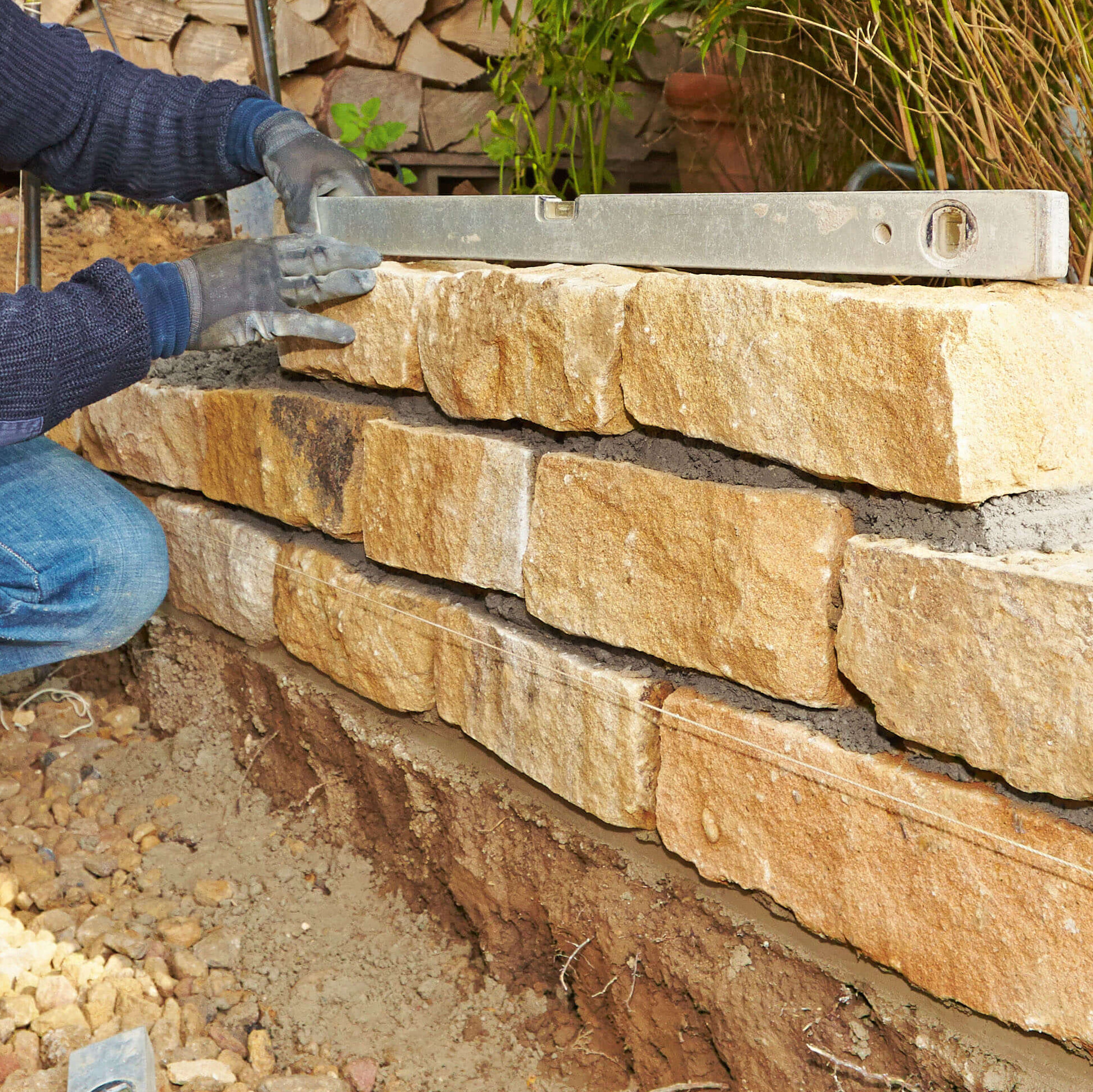 - Bei freistehenden Mauern können zwei Mauerreihen gesetzt werden, sodass beide Seiten eine schöne Oberfläche haben. Wenn die Mauer ein Blumenbeet oder eine Terrasse einfasst, reicht auch eine Mauerreihe.