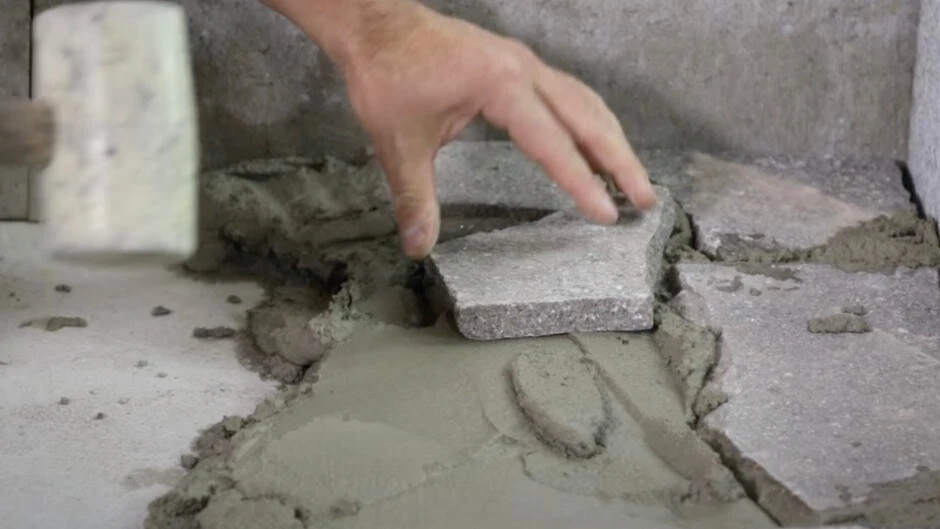 Bei der sogenannten Dickbettverlegung dient der Naturstein-Verlegemörtel gleichzeitig als Verlege- und Fugenmörtel. Die Natursteine werden in ein „dickes Bett“ aus Mörtel gelegt und mit dem Gummihammer eingeklopft, bis der Mörtel aus den Fugen quillt.
