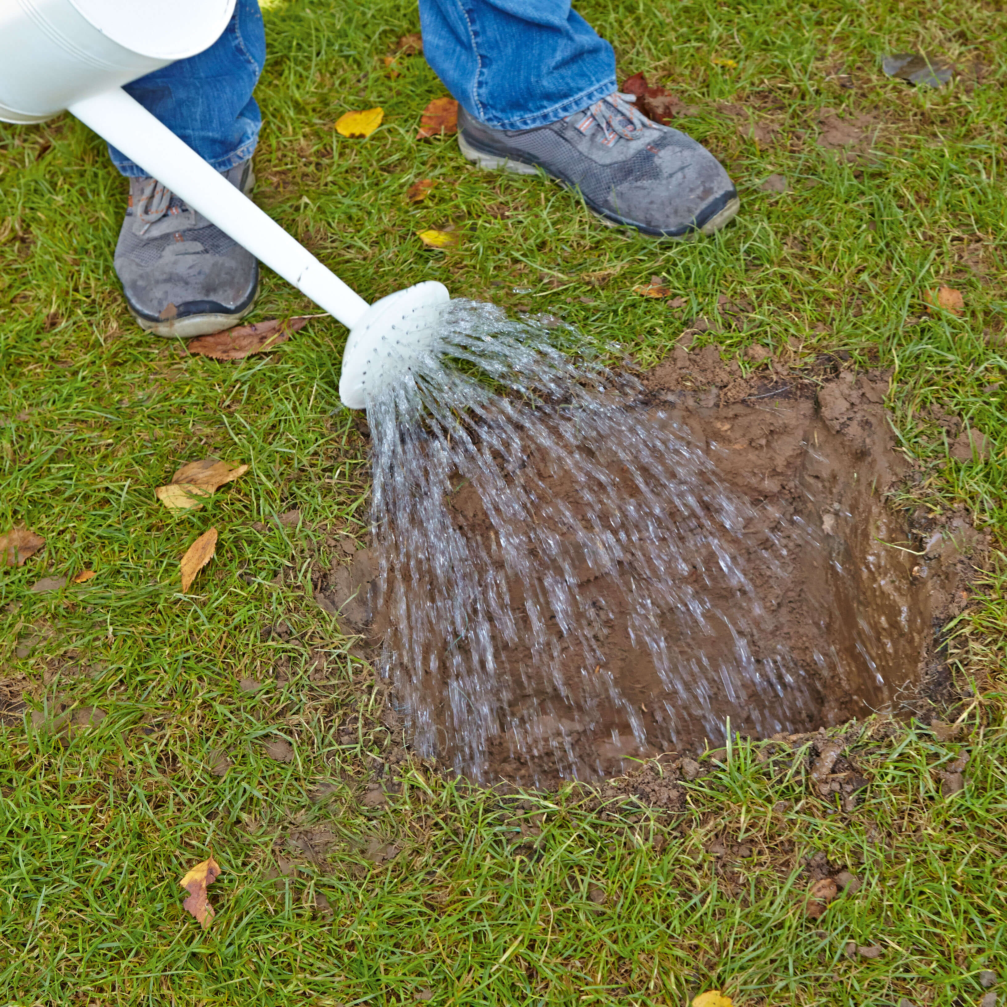 Hinweis: Die Wasserzugabemenge für einen 25-kg-Sack Ruck-Zuck Beton beträgt 3 bis 3,5 Liter. Den Ruck-Zuck Beton in Lagen von jeweils ca. 10 bis 15 cm einbringen und jede Lage vollständig mit Wasser aus einer Gießkanne begießen.